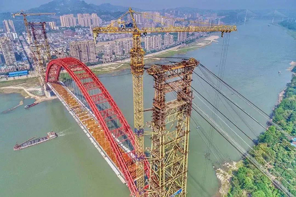 該橋?yàn)槭澜缰骺缈鐝阶畲蟮娘w燕式鋼管混凝土系桿拱橋,全長(zhǎng)1420米,主跨507米,采用2×170噸纜索起重機(jī)安裝,2019年7月3日合攏。